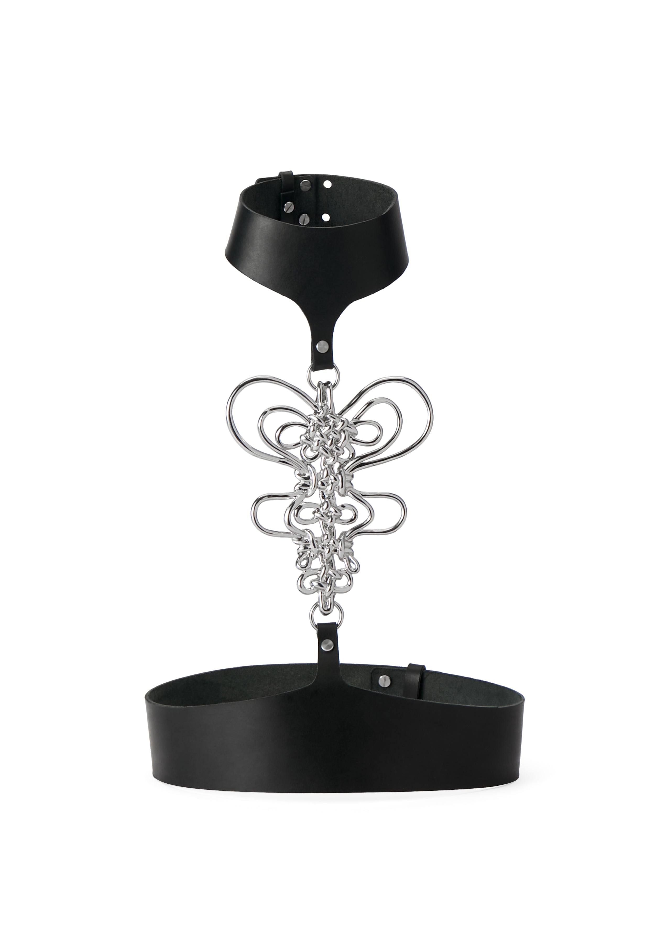 In the 2019 work of Tian Xiang, Chinese knots that typically incorporate silk, cotton or linen are instead made with patent leather cords. Commencing from a traditional method, but conferring onto the knots an atypical function akin to a corset or leather bag, the products take on new form and character.